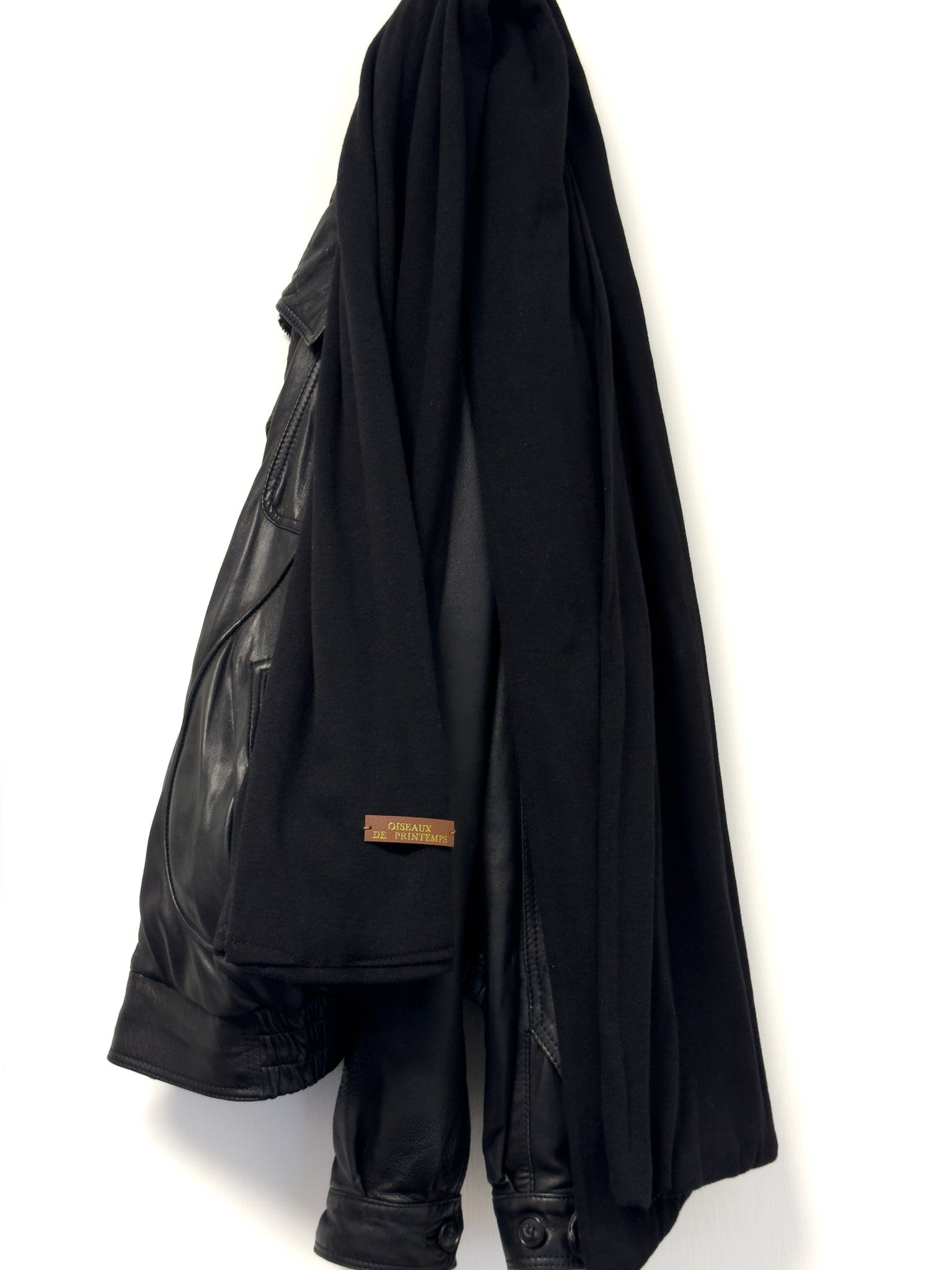A black two layer merino wool scarf from Australian sheep, finished with a brown calfskin word mark logo patch.